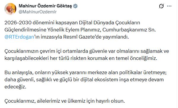 Bakan Göktaş, sanal medya hesabından yaptığı açıklamada, Resmi Gazetede yayımlan Dijital Dünyada Çocukların Güçlendirilmesine Yönelik Eylem Planının, çocuklar, aileler ve Türkiye için hayırlı olması dileğinde bulundu. Göktaş, “2026-2030 dönemini kapsayan Dijital Dünyada Çocukların Güçlendirilmesine Yönelik Eylem Planımız, Cumhurbaşkanımız Sayın Recep Tayyip Erdoğanın imzasıyla Resmi Gazetede yayımlandı. Çocuklarımızın çevrim içi ortamlarda güvenle var olmalarını sağlamak ve karşılaşabilecekleri her türlü riskten korumak en temel önceliğimiz. Bu anlayışla, onların yüksek yararını merkeze alan politikalar üretmeye; daha güvenli, sağlıklı ve güçlü bir dijital ekosistem inşa etmeye devam edeceğiz. Çocuklarımız, ailelerimiz ve ülkemiz için hayırlı olsun” ifadelerini kullandı.