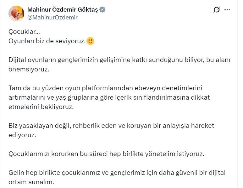 Bakan Göktaş, sanal medya hesabından yaptığı açıklamada, “Çocuklar. Oyunları biz de seviyoruz. Dijital oyunların gençlerimizin gelişimine katkı sunduğunu biliyor, bu alanı önemsiyoruz. Tam da bu yüzden oyun platformlarından ebeveyn denetimlerini artırmalarını ve yaş gruplarına göre içerik sınıflandırılmasına dikkat etmelerini bekliyoruz. Biz yasaklayan değil, rehberlik eden ve koruyan bir anlayışla hareket ediyoruz. Çocuklarımızı korurken bu süreci hep birlikte yönetelim istiyoruz. Gelin hep birlikte çocuklarımız ve gençlerimiz için daha güvenli bir dijital ortam sunalım” dedi.