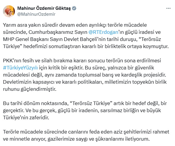 Bakan Göktaş, sosyal medya hesabı üzerinden yaptığı açıklamada, “Yarım asra yakın süredir devam eden ayrılıkçı terörle mücadele sürecinde, Cumhurbaşkanımız Sayın Recep Tayyip Erdoğan’ın güçlü iradesi ve MHP Genel Başkanı Sayın Devlet Bahçeli’nin tarihi duruşu, Terörsüz Türkiye hedefimizi somutlaştıran kararlı bir birliktelik ortaya koymuştur. PKKnın fesih ve silah bırakma kararı sonucu terörün sona erdirilmesi Türkiye Yüzyılı için kritik bir eşiktir. Bu süreç, yalnızca bir güvenlik mücadelesi değil, aynı zamanda toplumsal barış ve kardeşlik projesidir. Devletimizin kapsayıcı ve kararlı politikaları, milletimizin topyekûn birlik ruhunu güçlendirmiştir. Bu tarihi dönüm noktasında, Terörsüz Türkiye artık bir hedef değil, bir gerçektir. Ve bu gerçek, güçlü bir iradenin, sarsılmaz birliğin ve büyük Türkiye’nin zaferidir. Terörle mücadele sürecinde canlarını feda eden aziz şehitlerimizi rahmet ve minnetle anıyor, gazilerimize saygı ve şükranlarımı iletiyorum” ifadelerini kullandı.