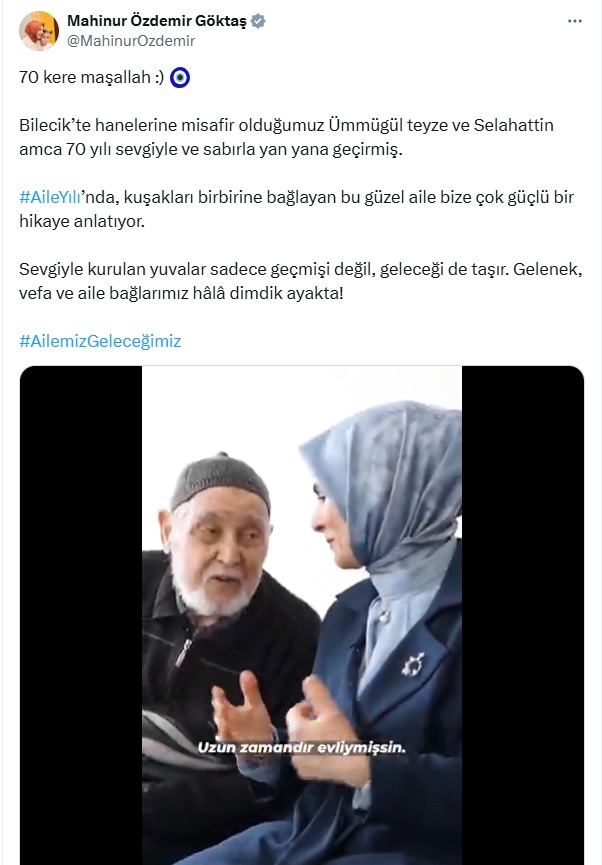 Bakan Göktaş, ziyarete ilişkin sosyal medya hesabından yaptığı açıklamada, “70 kere maşallah. Bilecik’te hanelerine misafir olduğumuz Ümmügül teyze ve Selahattin amca 70 yılı sevgiyle ve sabırla yan yana geçirmiş. Aile Yılı’nda, kuşakları birbirine bağlayan bu güzel aile bize çok güçlü bir hikaye anlatıyor. Sevgiyle kurulan yuvalar sadece geçmişi değil, geleceği de taşır. Gelenek, vefa ve aile bağlarımız hala dimdik ayakta” dedi.