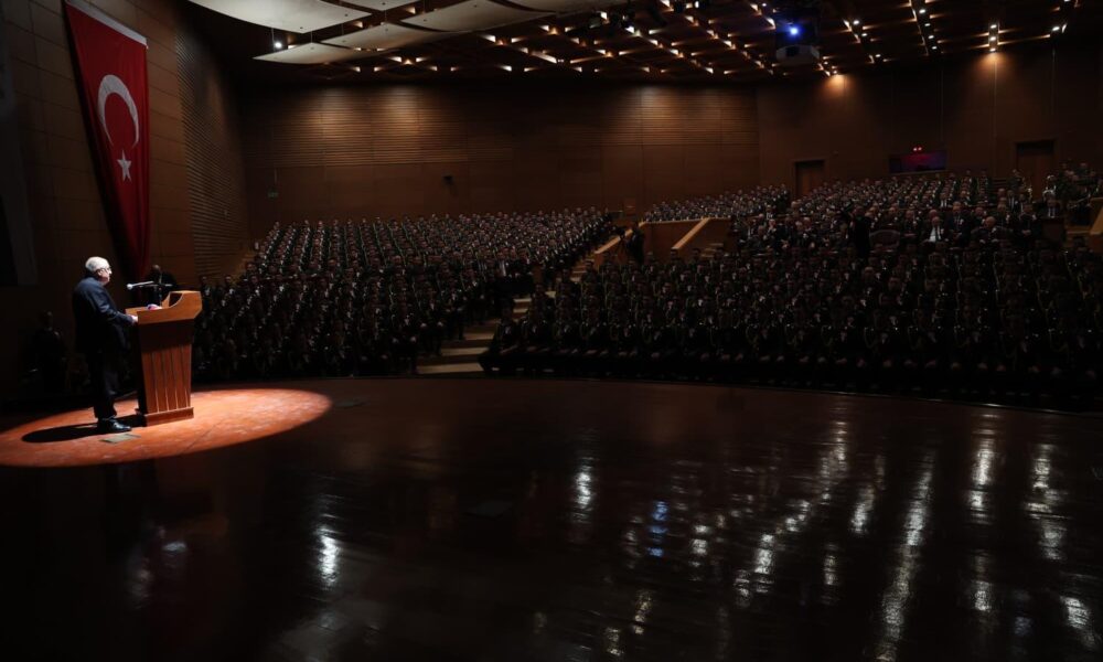 “Diplomasiyi önceleyerek çatışmaların sona erdirilmesi için çaba sarf ederken bekamıza yönelebilecek ihlallere karşı koymakta son derece muktedir olduğumuzu da her fırsatta ifade ediyoruz. Çevremizdeki bu ateş çemberine rağmen ülkemiz istikrar adası ve güvenlik merkezi olma vasfını sürdürmekte, bu konumunu korumak ve daha da güçlendirmek için Sayın Cumhurbaşkanımızın riyasetinde yoğun bir gayret göstermektedir. Çok iyi biliyoruz ki dünyanın en zorlu jeopolitik kuşaklarından birinde yer alan ülkemizin güvenliği güçlü bir devlet yapısını, etkin bir diplomasiyi ve caydırıcı bir askeri kapasiteyi gerektirmektedir. Bu kapsamda binlerce yıllık köklü geleneğiyle Türk Silahlı Kuvvetlerimiz; disiplinli yapısı, yüksek kabiliyetleri ve sahip olduğu saygın konumuyla ülkemizin ve milletimizin güvenliğinin en güçlü teminatıdır. Öte yandan devam eden sıcak çatışmalar dahil yaşanan kriz ve savaşlar askeri doktrini, savunma ve güvenlik tedbirlerini ve stratejik aklı sürekli geliştirmemiz gerektiğini de ortaya koymaktadır. Şüphesiz siz Harbiyeliler için de bu gelişmeler yalnızca takip etmeniz gereken hadiseler değil, geleceğin komutanlarına çıkarılacak dersler sunan askeri tecrübe kaynağı mahiyetindedir.”
