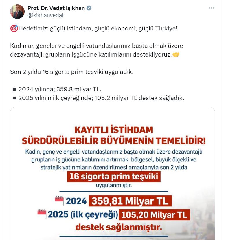 Bakan Işıkhan, sosyal medya hesabından yaptığı açıklamada, “Hedefimiz; güçlü istihdam, güçlü ekonomi, güçlü Türkiye. Kadınlar, gençler ve engelli vatandaşlarımız başta olmak üzere dezavantajlı grupların iş gücüne katılımlarını destekliyoruz. Son 2 yılda 16 sigorta prim teşviki uyguladık. 2024 yılında; 359,8 milyar TL, 2025 yılının ilk çeyreğinde; 105,2 milyar TL destek sağladık” ifadelerini kullandı.