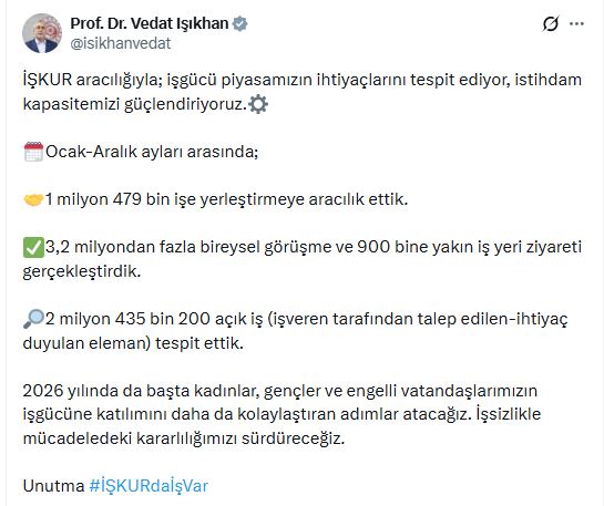 Bakan Işıkhan, sanal medya hesabından yaptığı açıklamada, “İŞKUR aracılığıyla; iş gücü piyasamızın ihtiyaçlarını tespit ediyor, istihdam kapasitemizi güçlendiriyoruz. Ocak-aralık ayları arasında; 1 milyon 479 bin işe yerleştirmeye aracılık ettik. 3,2 milyondan fazla bireysel görüşme ve 900 bine yakın iş yeri ziyareti gerçekleştirdik. 2 milyon 435 bin 200 açık iş (işveren tarafından talep edilen-ihtiyaç duyulan eleman) tespit ettik. 2026 yılında da başta kadınlar, gençler ve engelli vatandaşlarımızın iş gücüne katılımını daha da kolaylaştıran adımlar atacağız. İşsizlikle mücadeledeki kararlılığımızı sürdüreceğiz. Unutma İŞKURda iş var” ifadelerini kullandı.