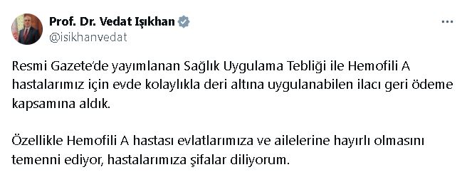 Bakan Işıkhan, sosyal medya hesabından yaptığı açıklamada, “Resmi Gazetede yayımlanan Sağlık Uygulama Tebliği ile Hemofili A hastalarımız için evde kolaylıkla deri altına uygulanabilen ilacı geri ödeme kapsamına aldık. Özellikle Hemofili A hastası evlatlarımıza ve ailelerine hayırlı olmasını temenni ediyor, hastalarımıza şifalar diliyorum” dedi.