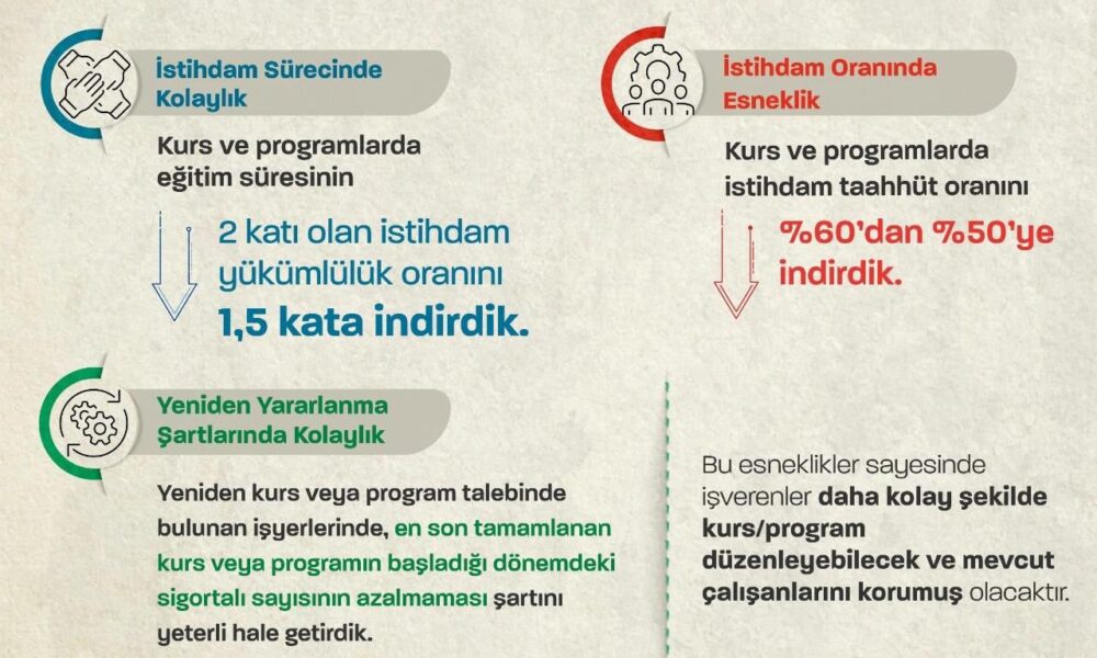 Bakan Işıkhan, sosyal medya hesabından yaptığı açıklamada, “İmalat sanayisindeki büyümeyi aktif işgücü piyasası programlarımız ile destekliyoruz. Resmi Gazetede yayımlanan kararla imalat sektöründe 31 Aralık 2026 tarihine kadar, işverenlere kolaylık sağlamak ve işsizlikle mücadele etmek amacıyla kurs ve programlarda eğitim süresinin 2 katı olan istihdam yükümlülük oranını 1.5 kata, istihdam taahhüt oranını yüzde 60’tan yüzde 50’ye indiriyoruz. Ayrıca gerekli şartlarda da iyileştirmeye giderek çalışma hayatının güçlendirilmesini destekliyoruz” dedi.