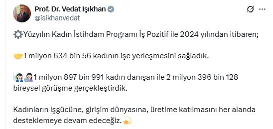 Çalışma ve Sosyal Güvenlik Bakanı Vedat Işıkhan, İş Pozitif programına ilişkin sosyal medya hesabından açıklama yaptı. Bakan Işıkhan, “Yüzyılın kadın istihdam programı İş Pozitif ile 2024 yılından itibaren 1 milyon 634 bin 56 kadının işe yerleşmesini sağladık. 1 milyon 897 bin 991 kadın danışan ile 2 milyon 396 bin 128 bireysel görüşme gerçekleştirdik. Kadınların iş gücüne, girişim dünyasına, üretime katılmasını her alanda desteklemeye devam edeceğiz” ifadelerini kullandı.