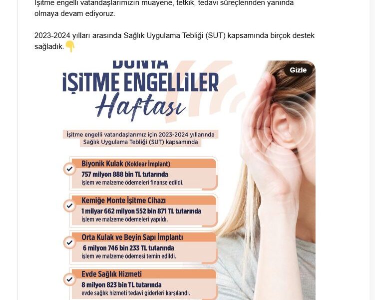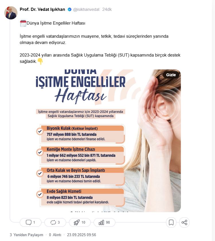 Çalışma ve Sosyal Güvenlik Bakanı Vedat Işıkhan, NSosyal hesabından yaptığı açıklamada, “İşitme engelli vatandaşlarımızın muayene, tetkik, tedavi süreçlerinden yanında olmaya devam ediyoruz. 2023-2024 yılları arasında Sağlık Uygulama Tebliği kapsamında birçok destek sağladık” dedi.