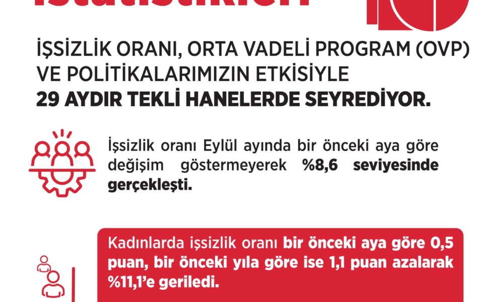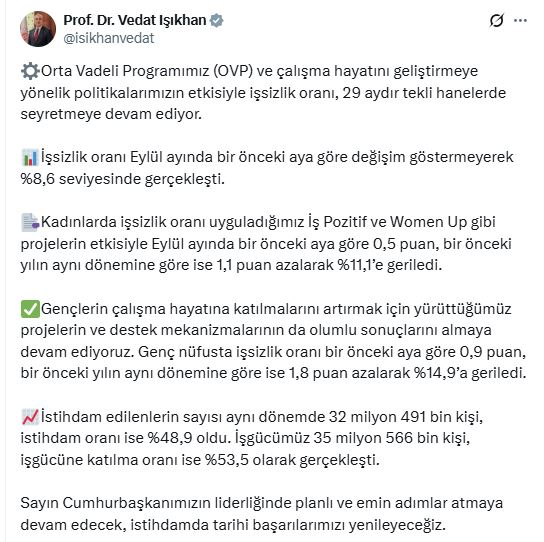 Çalışma ve Sosyal Güvenlik Bakanı Vedat Işıkhan, eylül ayı iş gücü istatistiklerine ilişkin sosyal medya hesabından açıklama yaptı. Bakan Işıkhan, “Orta Vadeli Programımız (OVP) ve çalışma hayatını geliştirmeye yönelik politikalarımızın etkisiyle işsizlik oranı, 29 aydır tekli hanelerde seyretmeye devam ediyor. İşsizlik oranı eylül ayında bir önceki aya göre değişim göstermeyerek yüzde 8,6 seviyesinde gerçekleşti. Kadınlarda işsizlik oranı uyguladığımız İş Pozitif ve Women Up gibi projelerin etkisiyle eylül ayında bir önceki aya göre 0,5 puan, bir önceki yılın aynı dönemine göre ise 1,1 puan azalarak yüzde 11,1e geriledi. Gençlerin çalışma hayatına katılmalarını artırmak için yürüttüğümüz projelerin ve destek mekanizmalarının da olumlu sonuçlarını almaya devam ediyoruz. Genç nüfusta işsizlik oranı bir önceki aya göre 0,9 puan, bir önceki yılın aynı dönemine göre ise 1,8 puan azalarak yüzde 14,9a geriledi. İstihdam edilenlerin sayısı aynı dönemde 32 milyon 491 bin kişi, istihdam oranı ise yüzde 48,9 oldu. İş gücümüz 35 milyon 566 bin kişi, iş gücüne katılma oranı ise yüzde 53,5 olarak gerçekleşti. Sayın Cumhurbaşkanımızın liderliğinde planlı ve emin adımlar atmaya devam edecek, istihdamda tarihi başarılarımızı yenileyeceğiz” ifadelerini kullandı.