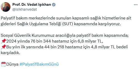 Bakan Vedat Işıkhan, sosyal medya hesabından yaptığı paylaşımda, “Palyatif bakım merkezlerinde sunulan kapsamlı sağlık hizmetlerine ait giderleri Sağlık Uygulama Tebliği kapsamında karşılıyoruz. Sosyal Güvenlik Kurumumuz aracılığıyla palyatif bakım kapsamında; 2024 yılında 76 bin 344 hastamız için 6,8 milyar TL, bu yılın ilk yarısında 44 bin 218 hastamız için 4,8 milyar TL bedeli karşıladık” ifadelerini kullandı.