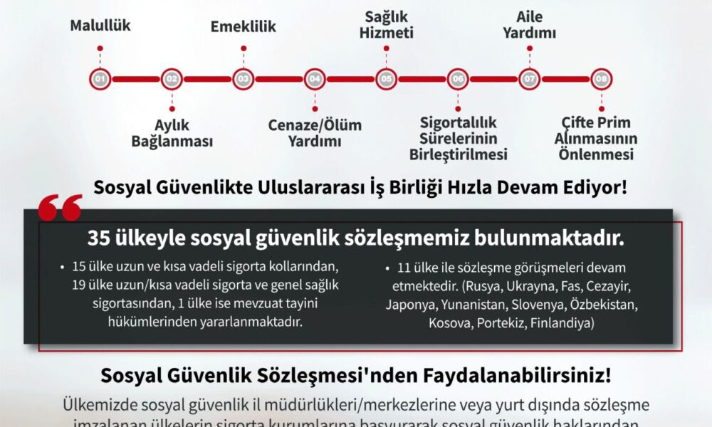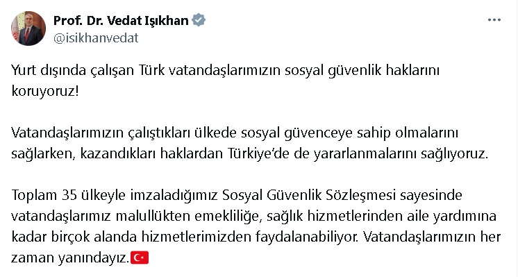 Bakanı Işıkhan, sosyal medya hesabından yaptığı açıklamada, yurt dışında çalışan Türk vatandaşlarının sosyal güvenlik haklarını koruduklarını belirterek, “Vatandaşlarımızın çalıştıkları ülkede sosyal güvenceye sahip olmalarını sağlarken, kazandıkları haklardan Türkiyede de yararlanmalarını sağlıyoruz. Toplam 35 ülkeyle imzaladığımız Sosyal Güvenlik Sözleşmesi sayesinde vatandaşlarımız malullükten emekliliğe, sağlık hizmetlerinden aile yardımına kadar birçok alanda hizmetlerimizden faydalanabiliyor. Vatandaşlarımızın her zaman yanındayız” ifadelerinin kullandı.