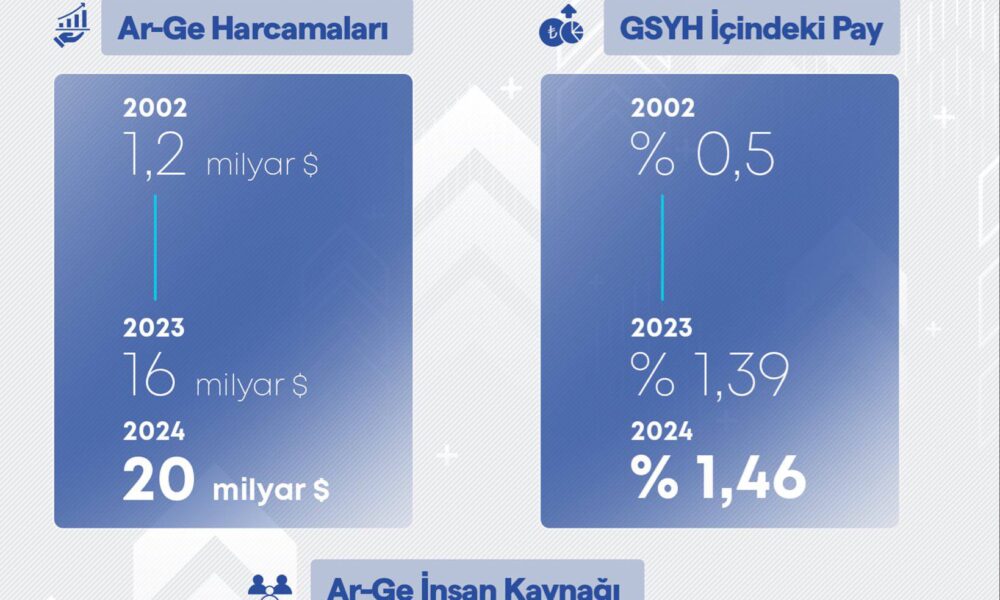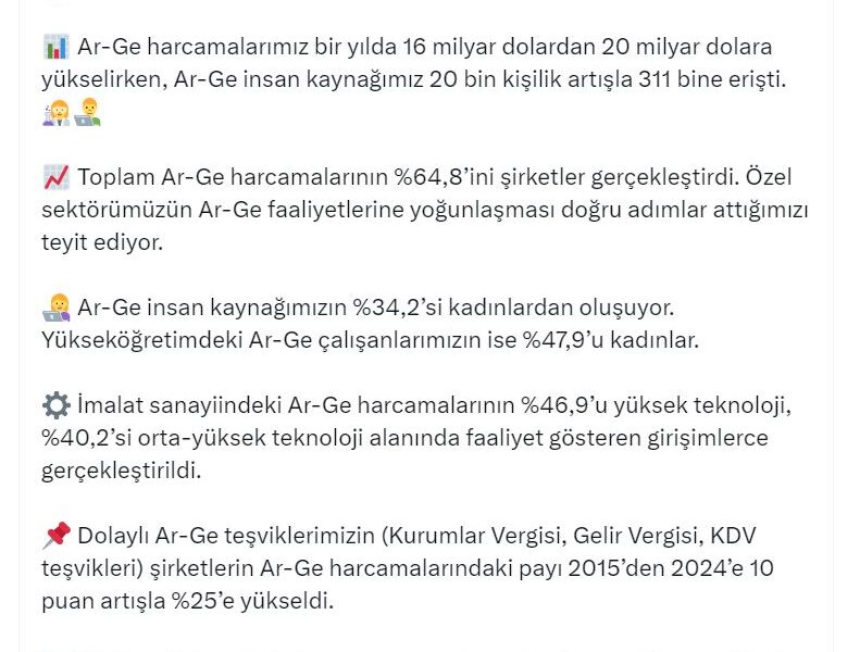 Bakan Kacır, ayrıca, “İmalat sanayiindeki Ar-Ge harcamalarının yüzde 46,9’u yüksek teknoloji, yüzde 40,2’si orta-yüksek teknoloji alanında faaliyet gösteren girişimlerce gerçekleştirildi. Dolaylı Ar-Ge teşviklerimizin (Kurumlar Vergisi, Gelir Vergisi, KDV teşvikleri) şirketlerin Ar-Ge harcamalarındaki payı 2015ten 2024e 10 puan artışla yüzde 25’e yükseldi. Türkiye; üniversiteleri, araştırma merkezleri, teknoparkları, yenilikçi girişimleri, Ar-Ge ve tasarım merkezleri ve nitelikli araştırma-geliştirme insan kaynağıyla küresel bir Ar-Ge üssüne dönüşüyor” ifadelerini kullandı.