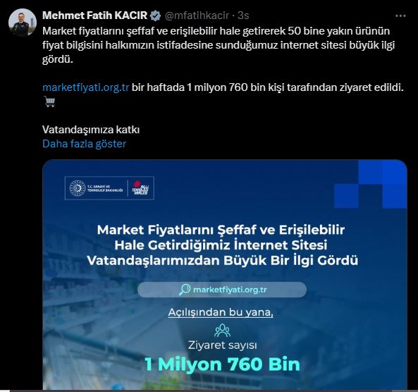 Bakan Kacır, sosyal medya hesabından yaptığı açıklamada “Market fiyatlarını şeffaf ve erişilebilir hale getirerek 50 bine yakın ürünün fiyat bilgisini halkımızın istifadesine sunduğumuz internet sitesi büyük ilgi gördü. http://marketfiyati.org.tr bir haftada 1 milyon 760 bin kişi tarafından ziyaret edildi. Vatandaşımıza katkı sunacak dijital uygulamalar geliştirmeye devam edeceğiz” dedi.