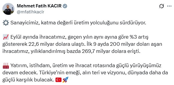 Sanayi ve Teknoloji Bakanı Mehmet Fatih Kacır, eylül ayı dış ticaret verilerine ilişkin sosyal medya hesabından açıklama yaptı. Bakan Kacır, “Sanayicimiz, katma değerli üretim yolculuğunu sürdürüyor. Eylül ayında ihracatımız, geçen yılın aynı ayına göre yüzde 3 artış göstererek 22,6 milyar dolara ulaştı. İlk 9 ayda 200 milyar doları aşan ihracatımız, yıllıklandırılmış bazda 269,7 milyar dolara erişti. Yatırım, istihdam, üretim ve ihracat rotasında güçlü yürüyüşümüz devam edecek. Türkiyenin emeği, alın teri ve vizyonu, dünyada daha da güçlü karşılık bulacak” dedi.