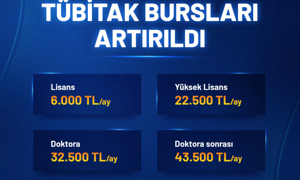 Bakan Mehmet Fatih Kacır, sanal medya hesabından yaptığı açıklamada, “Araştırmacılarımıza ve öğrencilerimize sunduğumuz TÜBİTAK burslarını artırdık. Hayırlı olsun. Güncel burs miktarları: Lisans öğrencileri için aylık 6 bin TL, yüksek lisans öğrencileri için aylık 22 bin 500 TL, doktora öğrencileri için aylık 32 bin 500 TL’ye ek olarak 11 bin TL’ye kadar performans ödemesi, doktora sonrası araştırmacılar için ise aylık 43 bin 500 TL’ye ek olarak 13 bin 500 TLye kadar performans ödemesi” ifadelerini kullandı.