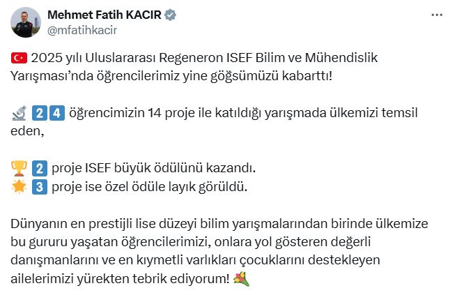 Bakan Kacır, sosyal medya hesabından yaptığı açıklamada, “2025 yılı Uluslararası Regeneron ISEF Bilim ve Mühendislik Yarışmasında öğrencilerimiz yine göğsümüzü kabarttı. 24 öğrencimizin 14 proje ile katıldığı yarışmada ülkemizi temsil eden, 2 proje ISEF büyük ödülünü kazandı, 3 proje ise özel ödüle layık görüldü. Dünyanın en prestijli lise düzeyi bilim yarışmalarından birinde ülkemize bu gururu yaşatan öğrencilerimizi, onlara yol gösteren değerli danışmanlarını ve en kıymetli varlıkları çocuklarını destekleyen ailelerimizi yürekten tebrik ediyorum” dedi.