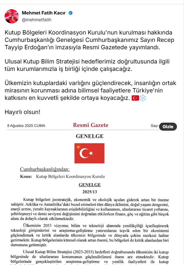 Sanayi ve Teknoloji Bakanı Bakanı Mehmet Fatih Kacır da Türkiye’nin sosyal medya platformu NeXT hesabından yaptığı paylaşımda, “Kutup Bölgeleri Koordinasyon Kurulunun kurulması hakkında Cumhurbaşkanlığı Genelgesi Cumhurbaşkanımız Sayın Recep Tayyip Erdoğan’ın imzasıyla Resmi Gazetede yayımlandı. Ulusal Kutup Bilim Stratejisi hedeflerimiz doğrultusunda ilgili tüm kurumlarımızla iş birliği içinde çalışacağız. Ülkemizin kutuplardaki varlığını güçlendirecek, insanlığın ortak mirasının korunması adına bilimsel faaliyetlere Türkiyenin katkısını en kuvvetli şekilde ortaya koyacağız” ifadelerini kullandı.