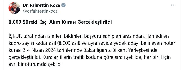 SAĞLIK Bakanı Fahrettin Koca, bakanlık bünyesinde 8 bin sürekli işçi istihdamı için 3-4 Nisanda kura çekimi yapıldığını açıkladı.Sağlık Bakanı Fahrettin Koca, sosyal medya hesabından yaptığı açıklamada, “İŞKUR tarafından isimleri bildirilen başvuru sahipleri arasından, ilan edilen kadro sayısı kadar asıl (8 bin) ve aynı sayıda yedek adayı belirleyen noter kurası 3-4 Nisan 2024 tarihlerinde Bakanlığımız Bilkent Yerleşkesinde gerçekleştirildi. Kuralar, illerin trafik koduna göre sıralı şekilde, her bir il için ayrı bir oturumda çekildi. Noter katılımı ve tespiti ile gerçekleştirilen kura, adayların izleyebilmeleri için Bakanlığımız YouTube kanalından canlı olarak yayınlandı, video yayını 2 milyondan fazla kişi tarafından izlendi” dedi.Kura sonuçlarının https://iscisonuc.saglik.gov.tr internet adresinden yayınlandığını aktaran Koca, “Adaylar, TC kimlik numarası ile giriş yaparak sonucunu öğrenebilmektedir. Kurada yerleşenlerin atamasına ilişkin bilgi ve belgeler ile diğer her türlü duyurular, önümüzdeki günlerde Yönetim Hizmetleri Genel Müdürlüğünün https://yhgm.saglik.gov.tr internet adresinde yayınlanacaktır” ifadelerini kullandı.