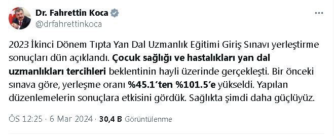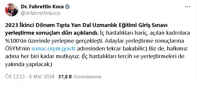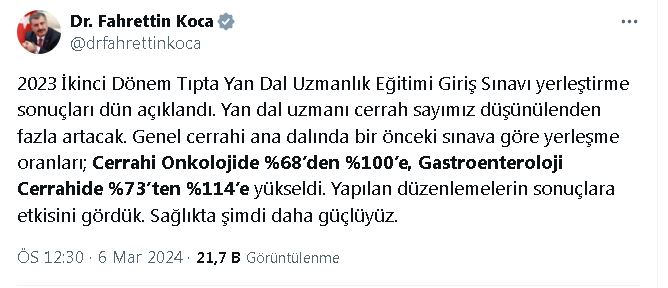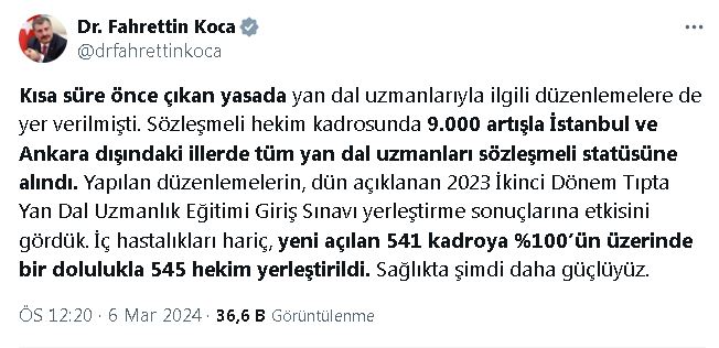 SAĞLIK Bakanı Fahrettin Koca, “İç hastalıkları hariç, yeni açılan 541 kadroya yüzde 100ün üzerinde bir dolulukla 545 hekim yerleştirildi” dedi.Bakan Koca, sosyal medya hesabından yaptığı açıklamada, “2023 ikinci dönem Tıpta Yan Dal Uzmanlık Eğitimi Giriş Sınavı yerleştirme sonuçları dün açıklandı. İç hastalıkları hariç, açılan kadrolara yüzde 100ün üzerinde yerleşme gerçekleşti. Adaylar yerleştirme sonuçlarına ÖSYMnin http://sonuc.osym.gov.tr adresinden tekrar bakabilir. Biz de halkımız adına her biri kadar mutluyuz. İç hastalıkları tercih ve yerleştirmeleri de yakında yapılacak. Kısa süre önce çıkan yasada yan dal uzmanlarıyla ilgili düzenlemelere de yer verilmişti. Sözleşmeli hekim kadrosunda 9 bin artışla İstanbul ve Ankara dışındaki illerde tüm yan dal uzmanları sözleşmeli statüsüne alındı. Yapılan düzenlemelerin, dün açıklanan yerleştirme sonuçlarına etkisini gördük. İç hastalıkları hariç, yeni açılan 541 kadroya yüzde 100ün üzerinde bir dolulukla 545 hekim yerleştirildi” dedi. YERLEŞME ORANI YÜZDE 101,5E YÜKSELDİYerleştirme sonuçlarında çocuk sağlığı ve hastalıkları yan dal uzmanlıkları tercihlerinin beklentinin hayli üzerinde gerçekleştiğine işaret eden Koca, “Bir önceki sınava göre, yerleşme oranı yüzde 45,1den yüzde 101,5e yükseldi. Yapılan düzenlemelerin sonuçlara etkisini gördük. Yan dal uzmanı cerrah sayımız düşünülenden fazla artacak. Genel cerrahi ana dalında bir önceki sınava göre yerleşme oranları; cerrahi onkolojide yüzde 68den yüzde 100e, gastroenteroloji cerrahide yüzde 73ten yüzde 114e yükseldi. Yapılan düzenlemelerin sonuçlara etkisini gördük. Sağlıkta şimdi daha güçlüyüz” değerlendirmesinde bulundu.