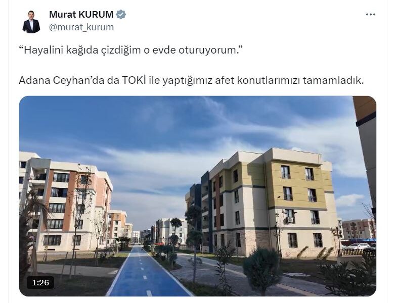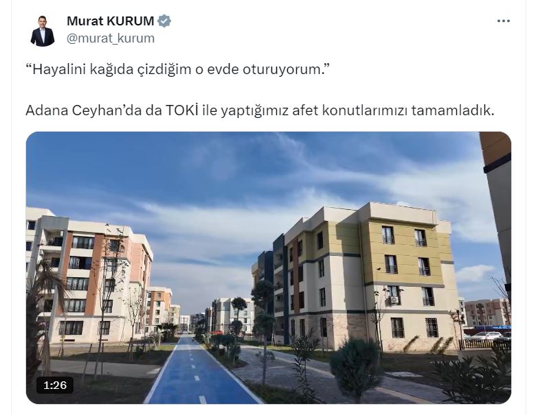 Bakanlıktan yapılan açıklamaya göre; Çevre, Şehircilik ve İklim Değişikliği Bakanlığı, 6 Şubat depremlerinden zarar gören Adanada da inşa ve ihya çalışmalarını aralıksız sürdürüyor. TOKİ, Ceyhan ilçesindeki Mithatpaşa Mahallesinde 3 etap olarak başlattığı 1357 afet konutunun tamamının inşasını bitirdi. Mithatpaşa Mahallesindeki yeni evlerine yerleşen vatandaşların görüntülerini sosyal medya hesabından paylaşan Çevre, Şehircilik ve İklim Değişikliği Bakanı Murat Kurum, hak sahibi Ceylan Gökün Hayalini kağıda çizdiğim o evde oturuyorum sözlerini alıntılayarak, “Adana Ceyhanda da TOKİ ile yaptığımız afet konutlarımızı tamamladık” ifadelerini kullandı.