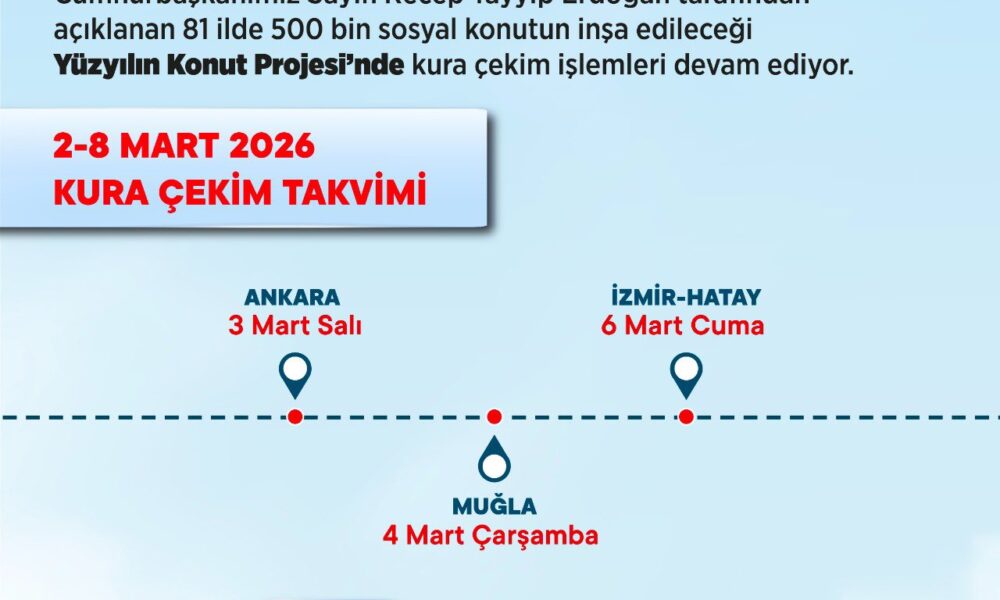 2-8 Mart haftası takvimine göre; 3 Mart Salı Ankara’da 31 bin 73, 4 Mart Çarşamba Muğla’da 6 bin 417, 6 Mart Cuma İzmir’de 21 bin 20, Hatay’da 13 bin 289 konutun daha hak sahipleri belirlenecek. 2-8 Mart haftasında 4 ilde 71 bin 799 konutun daha hak sahipleri belirlenmiş olacak. Böylece 79 ilde 403 bin 632 konut için kura çekimi tamamlanmış olacak.
