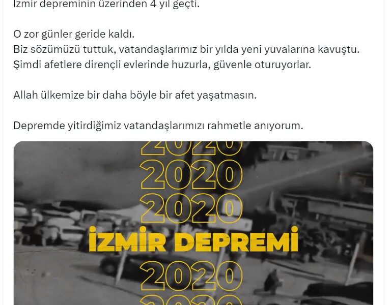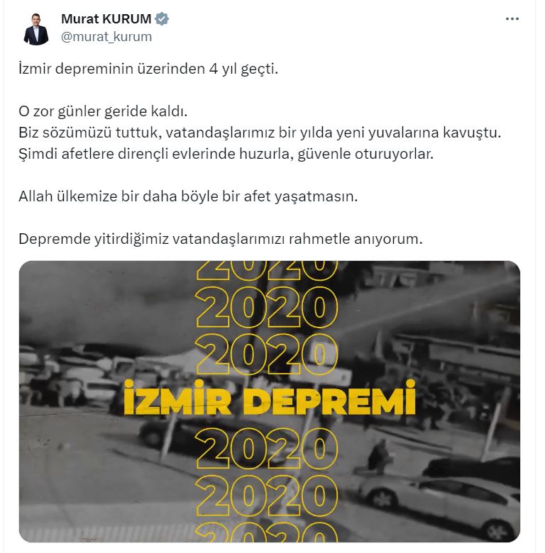 Çevre, Şehircilik ve İklim Değişikliği Bakanı Murat Kurum da sosyal medya hesabından İzmirdeki TOKİ konutlarının görüntülerini paylaşarak, “İzmir depreminin üzerinden 4 yıl geçti. O zor günler geride kaldı. Biz sözümüzü tuttuk, vatandaşlarımız bir yılda yeni yuvalarına kavuştu. Şimdi afetlere dirençli evlerinde huzurla, güvenle oturuyorlar. Allah ülkemize bir daha böyle bir afet yaşatmasın. Depremde yitirdiğimiz vatandaşlarımızı rahmetle anıyorum” dedi.