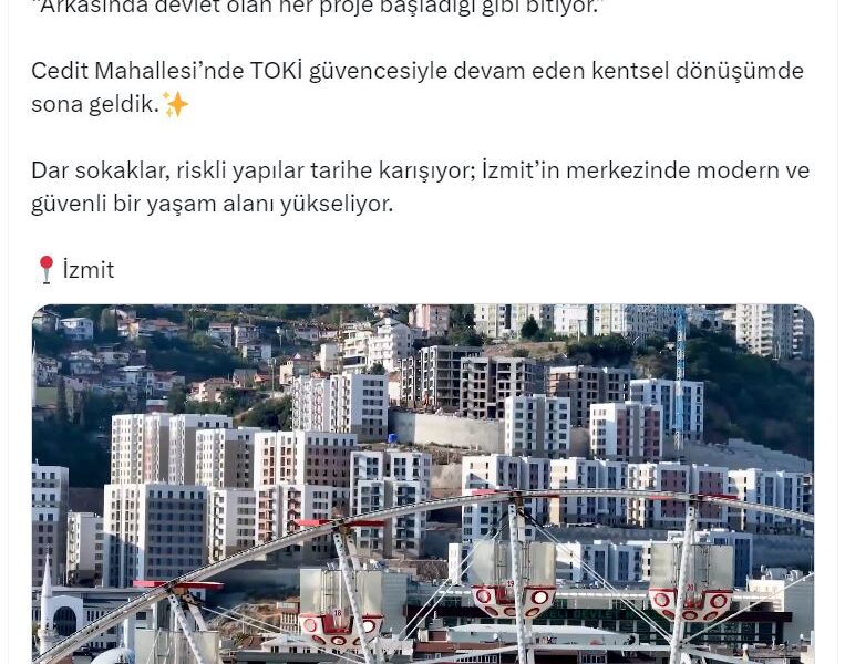 Bölgeden görüntüleri sanal medya hesabından paylaşan Bakan Kurum, hak sahibi Tuncay Kardaşın, “Arkasında devlet olan her proje başladığı gibi bitiyor” sözlerini alıntılayarak, “Cedit Mahallesinde TOKİ güvencesiyle devam eden kentsel dönüşümde sona geldik. Dar sokaklar, riskli yapılar tarihe karışıyor; İzmitin merkezinde modern ve güvenli bir yaşam alanı yükseliyor” ifadelerini kullandı.