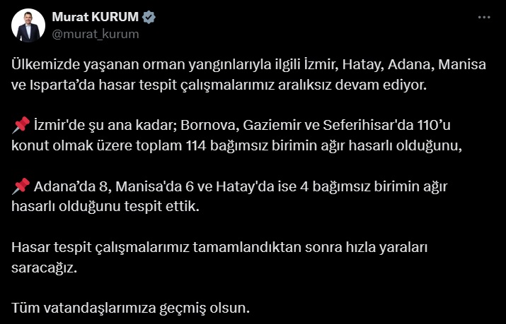 Çevre, Şehircilik ve İklim Değişikliği Bakanı Murat Kurum, sosyal medya hesabından yaptığı açıklamada, “Ülkemizde yaşanan orman yangınlarıyla ilgili İzmir, Hatay, Adana, Manisa ve Ispartada hasar tespit çalışmalarımız devam ediyor. İzmirde şu ana kadar; Bornova, Gaziemir ve Seferihisarda 110u konut olmak üzere toplam 114 bağımsız birimin ağır hasarlı olduğunu, Adanada 8, Manisada 6 ve Hatayda ise 4 bağımsız birimin ağır hasarlı olduğunu tespit ettik. Hasar tespit çalışmalarımız tamamlandıktan sonra hızla yaraları saracağız. Tüm vatandaşlarımıza geçmiş olsun” ifadelerini kullandı.