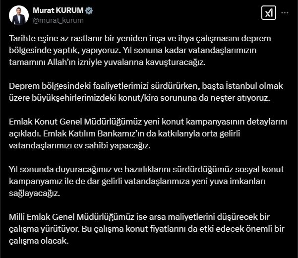 Bakan Kurum, “Tarihte eşine az rastlanır bir yeniden inşa ve ihya çalışmasını deprem bölgesinde yaptık, yapıyoruz. Yıl sonuna kadar vatandaşlarımızın tamamını Allahın izniyle yuvalarına kavuşturacağız. Deprem bölgesindeki faaliyetlerimizi sürdürürken, başta İstanbul olmak üzere büyükşehirlerimizdeki konut/kira sorununa da neşter atıyoruz. Emlak Konut Genel Müdürlüğümüz yeni konut kampanyasının detaylarını açıkladı. Emlak Katılım Bankamızın da katkılarıyla orta gelirli vatandaşlarımızı ev sahibi yapacağız. Yıl sonunda duyuracağımız ve hazırlıklarını sürdürdüğümüz sosyal konut kampanyamız ile de dar gelirli vatandaşlarımıza yeni yuva imkanları sağlayacağız. Milli Emlak Genel Müdürlüğümüz ise arsa maliyetlerini düşürecek bir çalışma yürütüyor. Bu çalışma konut fiyatlarına da etki edecek önemli bir çalışma olacak. İstanbulda, Ankarada ve diğer tüm şehirlerde vatandaşlarımız güvenli, sağlam ve uygun fiyatlı konutlara kavuşuncaya kadar durmayacağız” dedi.