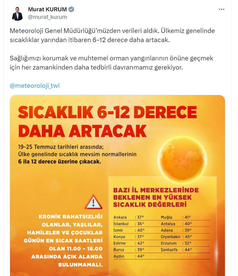 Bakan Murat Kurum, sosyal medya hesabından yaptığı açıklamada, “Meteoroloji Genel Müdürlüğümüzden verileri aldık. Ülkemiz genelinde sıcaklıklar yarından itibaren 6-12 derece daha artacak. Sağlığımızı korumak ve muhtemel orman yangınlarının önüne geçmek için her zamankinden daha tedbirli davranmamız gerekiyor” dedi.