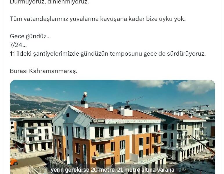 Çevre, Şehircilik ve İklim Değişikliği Bakanlığından yapılan açıklamaya göre; Bakanlık, 6 Şubat depremlerinin merkez üssü Kahramanmaraşta bugüne kadar 24 bin 420 konut, 30 iş yeri ve 10 bin 180 köy evi olmak üzere toplam 34 bin 630 bağımsız bölümü teslim etti. Yıl sonuna kadar da 53 bin 976 konut, 6 bin 397 iş yeri ve 13 bin 814 köy evi olmak üzere toplamda 74 bin 187 konut ve iş yeri teslim edilmiş olacak. Kahramanmaraş merkezdeki şantiyelerden gece ve gündüz görüntülerini sosyal medya hesabından paylaşan Bakan Murat Kurum, “Durmuyoruz, dinlenmiyoruz. Tüm vatandaşlarımız yuvalarına kavuşana kadar bize uyku yok. Gece gündüz 7/24, 11 ildeki şantiyelerimizde gündüzün temposunu gece de sürdürüyoruz” dedi.
