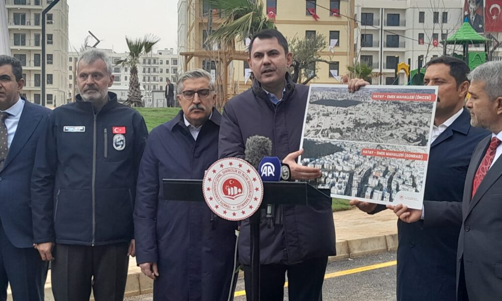 Çevre, Şehircilik ve İklim Değişikliği Bakanı Murat Kurum, Kahramanmaraş depremlerinde büyük yıkım yaşanan Hatayın merkez Emek Mahallesinde inşaatı devam eden Emek-Aksaray 3üncü Etap Projesinin süreciyle ilgili basın açıklaması yaptı. Emek ve Aksaray mahallerinde, depremin etkisini anlatan Bakan Kurum, “Mahallemiz; depremde çok büyük yıkım yaşadı. Öyle ki enkazlar kalktıktan sonra bölgeye gelen vatandaşlarımız eski evlerinin yerlerini bulmakta dahi zorlanıyorlardı. Koca bir tarla olmuş ancak mezarlıktan tanıyoruz mahallemizin yerini diyen Hataylı Zekiye Teyzemizin sözlerini unutmak mümkün değil. Ben, o günleri burada, milletimizle birlikte yaşamış biri olarak şunu büyük bir gönül huzuruyla ifade etmek isterim ki, o hüzünle baktığımız yerleri, şimdi sağlam, huzurlu ve güvenli yuvalarla doldurduk. Birkaç fotoğraf göstereceğim. Emek Mahallemizin eski ve yeni hali, Emekimizin fotoğrafı bunlar. Çünkü şu anda burası, adeta yeniden doğan bir kente dönüşmüş, Emek-Aksaray Mahallesi aksında inşa ettiğimiz 6 bin konut ve 655 iş yerimizle, örnek bir mahalle olmuştur. Büyük bir mutlulukla söylüyorum ki bu muhteşem mahalle artık, 75inci Yıl Bulvarına da erişerek, Hatayın kalbine uzanan, çok özel bir yaşam alanı olmuştur. Mahallemizi tüm altyapısı ve sosyal donatılarıyla beraber yeniden ayağa kaldırmanın mutluluğunu hep beraber yaşıyoruz. Ben bu vesileyle yeni yuvalarında yaşamaya başlayan tüm kardeşlerime, sağlık, mutluluk ve huzur diliyorum” dedi.