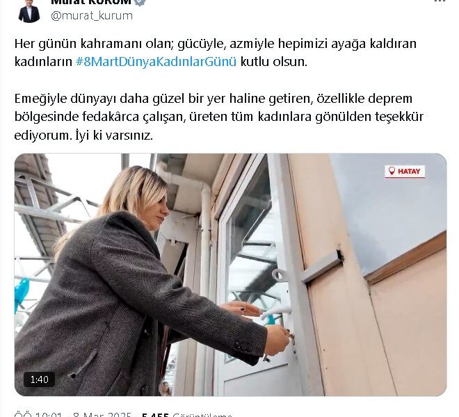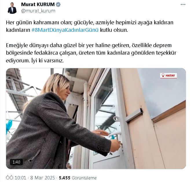 Çevre, Şehircilik ve İklim Değişikliği Bakanı Murat Kurum, sosyal medya hesabından Hatay Tarihi Uzun Çarşı esnafı 2 çocuk annesi Nezahat Boyacıgilin görüntülerini paylaştı. Bakan Kurum, mesajında, “Her günün kahramanı olan; gücüyle, azmiyle hepimizi ayağa kaldıran kadınların 8 Mart Dünya Kadınlar Günü kutlu olsun. Emeğiyle dünyayı daha güzel bir yer haline getiren, özellikle deprem bölgesinde fedakarca çalışan, üreten tüm kadınlara gönülden teşekkür ediyorum. İyi ki varsınız” ifadelerini kullandı.