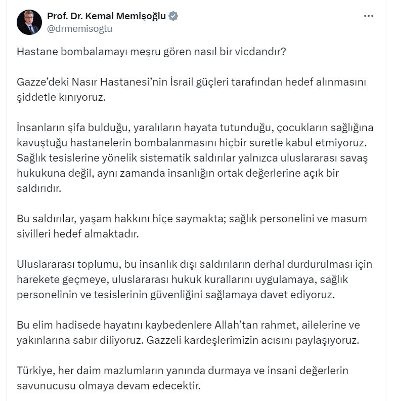 Bakan Memişoğlu, sosyal medya hesabından yaptığı açıklamada, “Hastane bombalamayı meşru gören nasıl bir vicdandır? Gazzedeki Nasır Hastanesinin İsrail güçleri tarafından hedef alınmasını şiddetle kınıyoruz. İnsanların şifa bulduğu, yaralıların hayata tutunduğu, çocukların sağlığına kavuştuğu hastanelerin bombalanmasını hiçbir suretle kabul etmiyoruz. Sağlık tesislerine yönelik sistematik saldırılar yalnızca uluslararası savaş hukukuna değil, aynı zamanda insanlığın ortak değerlerine açık bir saldırıdır” dedi.