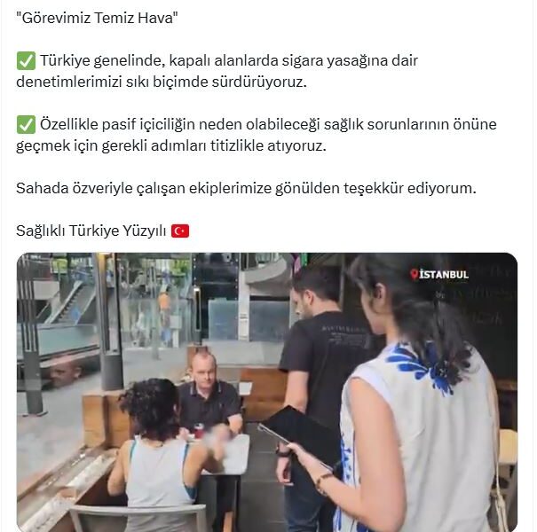 Bakan Kemal Memişolu, sosyal medya hesabından yaptığı açıklamada, “Görevimiz temiz hava, Türkiye genelinde, kapalı alanlarda sigara yasağına dair denetimlerimizi sıkı biçimde sürdürüyoruz. Özellikle pasif içiciliğin neden olabileceği sağlık sorunlarının önüne geçmek için gerekli adımları titizlikle atıyoruz. Sahada özveriyle çalışan ekiplerimize gönülden teşekkür ediyorum” dedi.