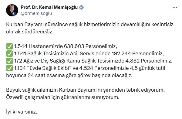 Sağlık Bakanı Kemal Memişoğlu, bayram sürecindeki sağlık hizmetlerine ilişkin sosyal medya hesabından açıklama yaptı. Bakan Memişoğlu, “Kurban Bayramı süresince sağlık hizmetlerimizin devamlılığını kesintisiz olarak sürdüreceğiz. 1544 hastanemizde 638 bin 603 personelimiz, 1541 sağlık tesisimizin acil servislerinde 192 bin 244 personelimiz, 172 ağız ve diş sağlığı kamu sağlık tesisimizde 4 bin 882 personelimiz, 1194 evde sağlık ekibi ve 4 bin 524 personelimizle 4,5 günlük tatil boyunca 24 saat esasına göre görev başında olacağız. Büyük sağlık ailemizin Kurban Bayramını şimdiden tebrik ediyorum. Özverili çalışmaları için şükranlarımı sunuyorum. İyi ki varsınız” ifadelerini kullandı.