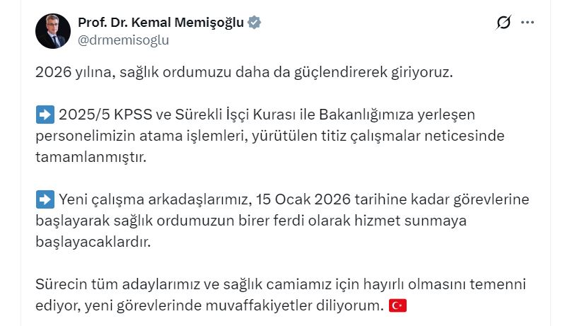 Bakan Memişoğlu, sanal medya hesabından yaptığı açıklamada, “2026 yılına, sağlık ordumuzu daha da güçlendirerek giriyoruz. 2025/5 KPSS ve Sürekli İşçi Kurası ile Bakanlığımıza yerleşen personelimizin atama işlemleri, yürütülen titiz çalışmalar neticesinde tamamlanmıştır. Yeni çalışma arkadaşlarımız, 15 Ocak 2026 tarihine kadar görevlerine başlayarak sağlık ordumuzun birer ferdi olarak hizmet sunmaya başlayacaklardır. Sürecin tüm adaylarımız ve sağlık camiamız için hayırlı olmasını temenni ediyor, yeni görevlerinde muvaffakiyetler diliyorum” ifadelerini kullandı.
