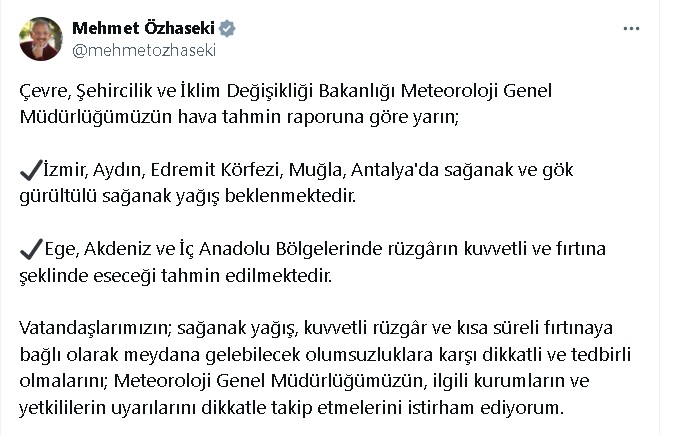 ÇEVRE, Şehircilik ve İklim Değişikliği Bakanı Mehmet Özhaseki, İzmir, Aydın, Edremit Körfezi, Muğla ve Antalyada sağanak ve gök gürültülü sağanak yağış beklendiğini duyurarak, vatandaşları, meydana gelebilecek olumsuzluklara karşı dikkatli ve tedbirli olmaları konusunda uyardı.Çevre, Şehircilik ve İklim Değişikliği Bakanı Mehmet Özhaseki, sosyal medya hesabından bazı illerde sağanak yağış olacağını duyurarak, şunları söyledi:”Çevre, Şehircilik ve İklim Değişikliği Bakanlığı Meteoroloji Genel Müdürlüğümüzün hava tahmin raporuna göre yarın; İzmir, Aydın, Edremit Körfezi, Muğla, Antalyada sağanak ve gök gürültülü sağanak yağış beklenmektedir. Ege, Akdeniz ve İç Anadolu Bölgelerinde rüzgârın kuvvetli ve fırtına şeklinde eseceği tahmin edilmektedir. Vatandaşlarımızın; sağanak yağış, kuvvetli rüzgâr ve kısa süreli fırtınaya bağlı olarak meydana gelebilecek olumsuzluklara karşı dikkatli ve tedbirli olmalarını; Meteoroloji Genel Müdürlüğümüzün, ilgili kurumların ve yetkililerin uyarılarını dikkatle takip etmelerini istirham ediyorum.”