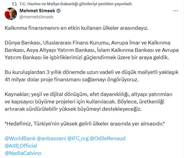 Hazine ve Maliye Bakanı Mehmet Şimşek, sosyal medya hesabından yaptığı açıklamada, “Kalkınma finansmanını en etkin kullanan ülkeler arasındayız. Dünya Bankası, Uluslararası Finans Kurumu, Avrupa İmar ve Kalkınma Bankası, Asya Altyapı Yatırım Bankası, İslam Kalkınma Bankası ve Avrupa Yatırım Bankası ile iş birliklerimizi güçlendirmek üzere bir araya geldik. Bu kuruluşlardan 3 yıllık dönemde uzun vadeli ve düşük maliyetli, yaklaşık 41 milyar dolar proje finansmanı sağlamayı öngörüyoruz. Kaynaklar; yeşil ve dijital dönüşüm, afet dayanıklılığı, altyapı yatırımları ve kapsayıcı büyüme projeleri için kullanılacak. Böylece, üretkenliği artırarak sürdürülebilir yüksek büyümeyi destekleyeceğiz. Hedefimiz, Türkiyenin yüksek gelirli ülkeler arasında yer almasıdır” dedi.