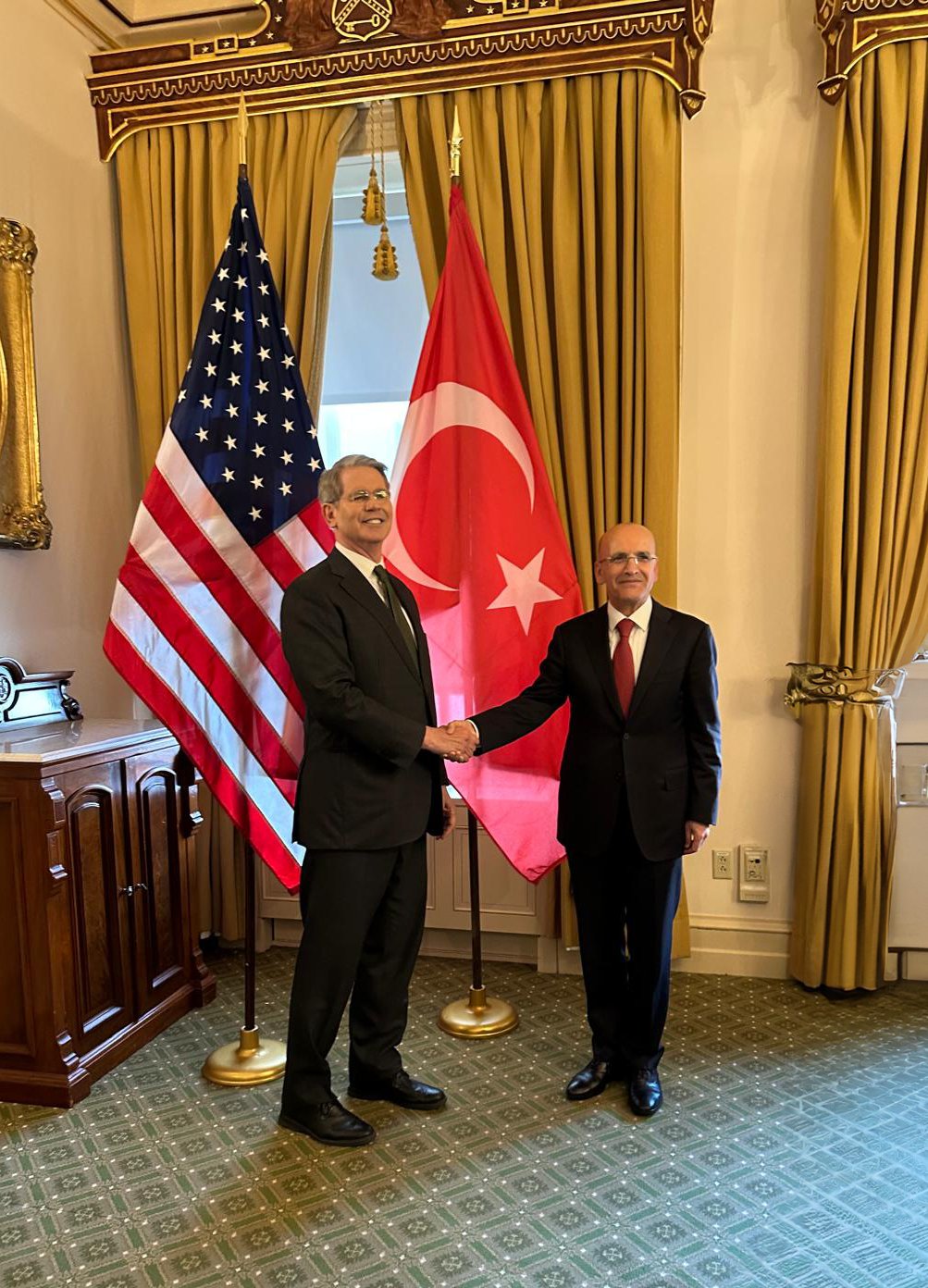 Bakanlıktan yapılan yazılı açıklamada, “Washingtonu ziyaret etmekte olan Sayın Hazine ve Maliye Bakanımız Mehmet Simsek bugün ABD Hazine Bakanı Scott Bessent ile görüşmüştür. Merkez Bankası Başkanı Fatih Karahanın da katıldığı ve yapıcı bir havada gerçeklesen görüşmede, Sayın Cumhurbaşkanımız ve Başkan Trump tarafından ortaya konan ortak siyasi irade uyarınca Türkiye ve ABD arasındaki ilişkilerin çok boyutlu olarak ilerletilmesi imkanları üzerinde durulmuştur. Bu bağlamda, tarafımızca yatırım ve ticaret, ulaştırma ve enerji alanlarındaki iş birliği fırsatlarına değinilmiş, savunma sanayi alanında iş birliğinin geliştirilmesini teminen mevcut kısıtlamaların kaldırılmasının önemi vurgulanmıştır. Türkiyede yürütülen ekonomik istikrar programı hakkında bilgi verilmiştir” denildi.