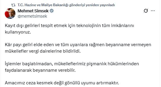 Hazine ve Maliye Bakanı Mehmet Şimşek, kayıt dışı ekonomiyle mücadele çalışmalarına ilişkin sosyal medya hesabından açıklama yaptı. Bakan Şimşek, “Kayıt dışı gelirleri tespit etmek için teknolojinin tüm imkanlarını kullanıyoruz. Kar payı geliri elde eden ve tüm uyarılara rağmen beyanname vermeyen mükellefler vergi dairelerine bildirildi. İşlemler başlatılmadan, mükelleflerimiz pişmanlık hükümlerinden faydalanarak beyanname verebilir. Amacımız ceza kesmek değil gönüllü uyumu artırmaktır” ifadelerini kullandı.
