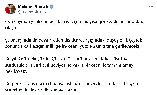 HAZİNE ve Maliye Bakanı Mehmet Şimşek, “Ocak ayında yıllık cari açıktaki iyileşme, mayısa göre 22,6 milyar dolara ulaştı. Şubat ayında da devam eden dış ticaret açığındaki düşüşle ilk çeyrek sonunda cari açığın milli gelire oranı yüzde 3ün altına gerileyecektir” dedi.Bakan Şimşek, sosyal medya hesabından yaptığı açıklamada, Türkiye Cumhuriyet Merkez Bankasınca açıklanan ödemeler dengesi istatistiklerini değerlendirdi. Ocak ayında yıllık cari açıktaki iyileşmenin, mayısa göre 22,6 milyar dolara ulaştığını belirten Şimşek, “Şubat ayında da devam eden dış ticaret açığındaki düşüşle ilk çeyrek sonunda cari açığın milli gelire oranı yüzde 3ün altına gerileyecektir. Bu yılı OVPdeki (Orta Vadeli Program) yüzde 3,1 olan öngörümüzden daha düşük ve sürdürülebilir cari açık seviyesine yakın bir oran ile tamamlamayı bekliyoruz. Bu performans makro finansal istikrarı güçlendirerek dezenflasyon sürecine de ilave katkı sağlayacaktır” ifadelerini kullandı.
