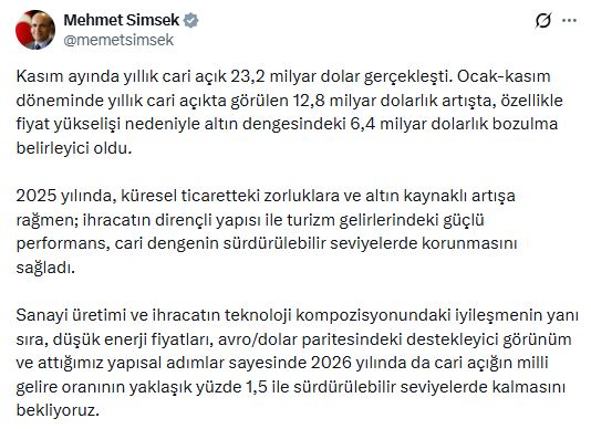 Hazine ve Maliye Bakanı Mehmet Şimşek, kasım ayı ödemeler dengesi istatistiklerine ilişkin sanal medya hesabından açıklama yaptı. Bakan Şimşek, “Kasım ayında yıllık cari açık 23,2 milyar dolar gerçekleşti. Ocak-kasım döneminde yıllık cari açıkta görülen 12,8 milyar dolarlık artışta, özellikle fiyat yükselişi nedeniyle altın dengesindeki 6,4 milyar dolarlık bozulma belirleyici oldu. 2025 yılında, küresel ticaretteki zorluklara ve altın kaynaklı artışa rağmen; ihracatın dirençli yapısı ile turizm gelirlerindeki güçlü performans, cari dengenin sürdürülebilir seviyelerde korunmasını sağladı. Sanayi üretimi ve ihracatın teknoloji kompozisyonundaki iyileşmenin yanı sıra, düşük enerji fiyatları, avro/dolar paritesindeki destekleyici görünüm ve attığımız yapısal adımlar sayesinde 2026 yılında da cari açığın milli gelire oranının yaklaşık yüzde 1,5 ile sürdürülebilir seviyelerde kalmasını bekliyoruz” ifadelerini kullandı.
