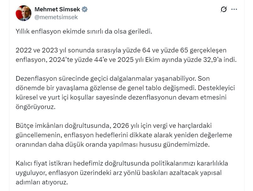 Bakan Şimşek, Türkiye İstatistik Kurumunun (TÜİK) açıkladığı Ekim 2025 dönemine ilişkin enflasyon verileriyle ilgili değerlendirmede bulundu. Şimşek, sosyal medya hesabından yaptığı açıklamada, “Yıllık enflasyon ekimde sınırlı da olsa geriledi. 2022 ve 2023 yıl sonunda sırasıyla yüzde 64 ve yüzde 65 gerçekleşen enflasyon, 2024te yüzde 44e ve 2025 yılı ekim ayında yüzde 32,9a indi. Dezenflasyon sürecinde geçici dalgalanmalar yaşanabiliyor. Son dönemde bir yavaşlama gözlense de genel tablo değişmedi. Destekleyici küresel ve yurt içi koşullar sayesinde dezenflasyonun devam etmesini öngörüyoruz. Bütçe imkanları doğrultusunda, 2026 yılı için vergi ve harçlardaki güncellemenin, enflasyon hedeflerini dikkate alarak yeniden değerleme oranından daha düşük oranda yapılması hususu gündemimizde. Kalıcı fiyat istikrarı hedefimiz doğrultusunda politikalarımızı kararlılıkla uyguluyor, enflasyon üzerindeki arz yönlü baskıları azaltacak yapısal adımları atıyoruz” dedi.