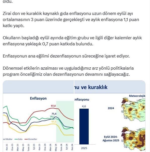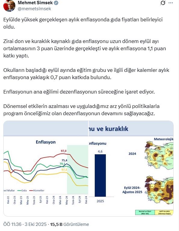 Bakan Şimşek, eylül ayı enflasyon verilerine ilişkin sosyal medya hesabından açıklama yaptı. Şimşek, “Eylülde yüksek gerçekleşen aylık enflasyonda gıda fiyatları belirleyici oldu. Zirai don ve kuraklık kaynaklı gıda enflasyonu uzun dönem eylül ayı ortalamasının 3 puan üzerinde gerçekleşti ve aylık enflasyona 1,1 puan katkı yaptı. Okulların başladığı eylül ayında eğitim grubu ve ilgili diğer kalemler aylık enflasyona yaklaşık 0,7 puan katkıda bulundu. Enflasyonun ana eğilimi dezenflasyonun süreceğine işaret ediyor. Dönemsel etkilerin azalması ve uyguladığımız arz yönlü politikalarla program önceliğimiz olan dezenflasyonun devamını sağlayacağız” dedi.