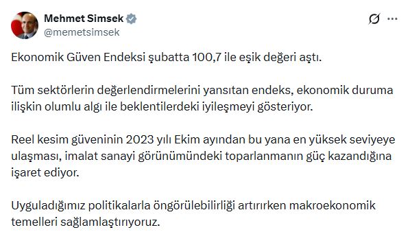 Bakan Şimşek: Ekonomik güven endeksi şubatta 100,7 ile eşik değeri aştı