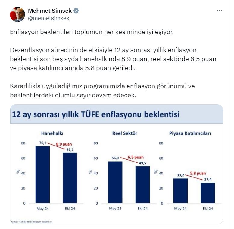 Bakan Mehmet Şimşek, sosyal medya hesabından yaptığı açıklamada, “Enflasyon beklentileri toplumun her kesiminde iyileşiyor. Dezenflasyon sürecinin de etkisiyle 12 ay sonrası yıllık enflasyon beklentisi son 5 ayda hanehalkında 8,9 puan, reel sektörde 6,5 puan ve piyasa katılımcılarında 5,8 puan geriledi. Kararlılıkla uyguladığımız programımızla enflasyon görünümü ve beklentilerdeki olumlu seyir devam edecek” ifadelerini kullandı.