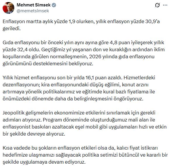 Hazine ve Maliye Bakanı Mehmet Şimşek, mart ayı enflasyon verilerine ilişkin sanal medya hesabından açıklama yaptı. Şimşek, “Enflasyon martta aylık yüzde 1,9 olurken, yıllık enflasyon yüzde 30,9’a geriledi. Gıda enflasyonu bir önceki yılın aynı ayına göre 4,8 puan iyileşerek yıllık yüzde 32,4 oldu. Geçtiğimiz yıl yaşanan don ve kuraklığın ardından iklim koşullarında görülen normalleşmenin, 2026 yılında gıda enflasyonu görünümünü desteklemesini bekliyoruz. Yıllık hizmet enflasyonu son bir yılda 16,1 puan azaldı. Hizmetlerdeki dezenflasyonun; kira enflasyonundaki düşüş eğilimi, konut arzını artırmaya yönelik politikalarımız ve eğitimde kural bazlı fiyatlama ile önümüzdeki dönemde daha da belirginleşmesini öngörüyoruz” dedi.