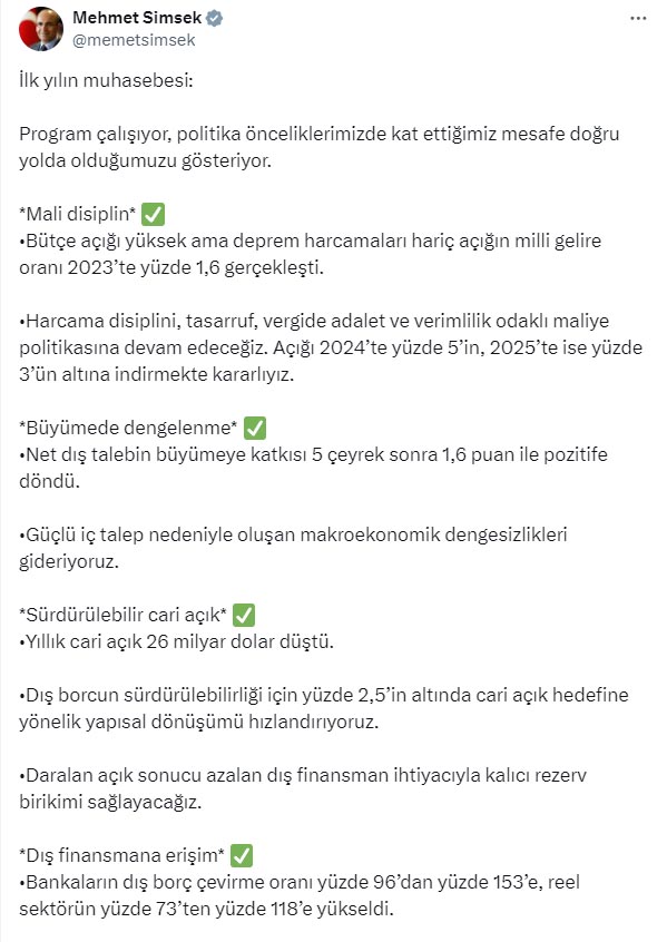 Şimşek, mesajında şunları kaydetti: “Yıllık enflasyonda en yüksek seviye geride kaldı. Enflasyonda belirgin ve kalıcı düşüş dönemine giriyoruz. Piyasanın 12 ay sonrası enflasyon beklentisi yüzde 33,2, 24 ay sonrası beklentisi yüzde 21,3 seviyesinde. Güven artıyor. Risk primimiz CDS 440 baz puan düştü. Kredi notumuz arttı, görünümümüz pozitif. Gri listeden çıkış sürecinde teknik çalışmalar tamamlandı, yerinde denetim yapıldı. Teknik rapor olumlu. Kara paranın aklanması ve terörizmin finansmanı ile mücadelede kararlıyız. Yapısal dönüşümde yeni sanayi politikası uyguluyoruz. İkiz dönüşümü hızlandırıyoruz. Yatırım ortamının iyileştirilmesi ile uluslararası doğrudan yatırımları artırmayı hedefliyoruz. Sonuç olarak; program çalışıyor ama daha kat edecek yolumuz var. Enflasyonu tek haneye indirmek meşakkatli olsa da programımızı kararlılıkla uygulayarak başaracağız. Tüm hedeflerimize ulaşmakta kararlıyız.”