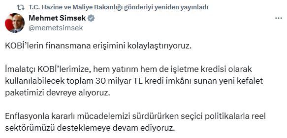 Hazine ve Maliye Bakanı Mehmet Şimşek, sosyal medya hesabından yaptığı açıklamada, “KOBİlerin finansmana erişimini kolaylaştırıyoruz. İmalatçı KOBİlerimize, hem yatırım hem de işletme kredisi olarak kullanılabilecek toplam 30 milyar TL kredi imkanı sunan yeni kefalet paketimizi devreye alıyoruz. Enflasyonla kararlı mücadelemizi sürdürürken seçici politikalarla reel sektörümüzü desteklemeye devam ediyoruz” dedi.