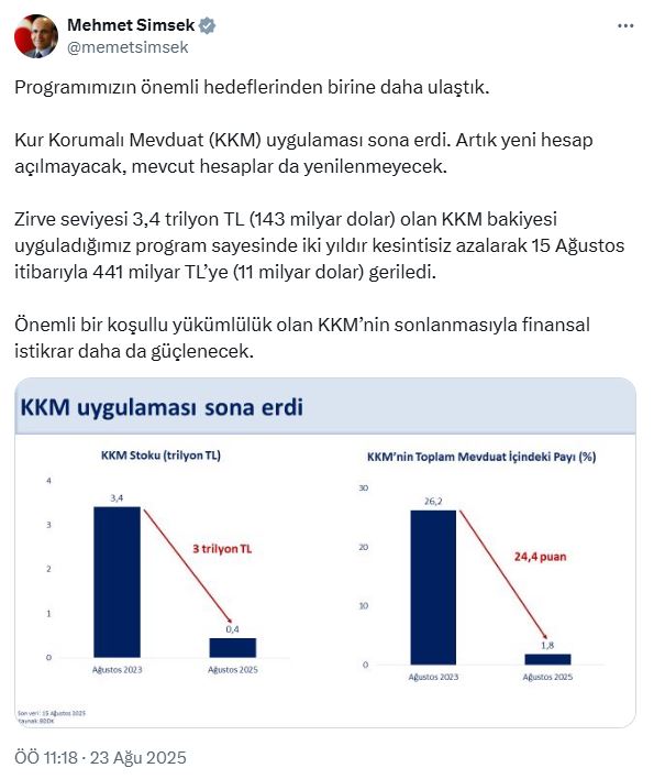 Hazine ve Maliye Bakanı Mehmet Şimşek, sosyal medya hesabından yaptığı açıklamada, “Programımızın önemli hedeflerinden birine daha ulaştık. Kur Korumalı Mevduat uygulaması sona erdi. Artık yeni hesap açılmayacak, mevcut hesaplar da yenilenmeyecek. Zirve seviyesi 3,4 trilyon TL (143 milyar dolar) olan KKM bakiyesi uyguladığımız program sayesinde iki yıldır kesintisiz azalarak 15 Ağustos itibarıyla 441 milyar TLye (11 milyar dolar) geriledi. Önemli bir koşullu yükümlülük olan KKMnin sonlanmasıyla finansal istikrar daha da güçlenecek” dedi.